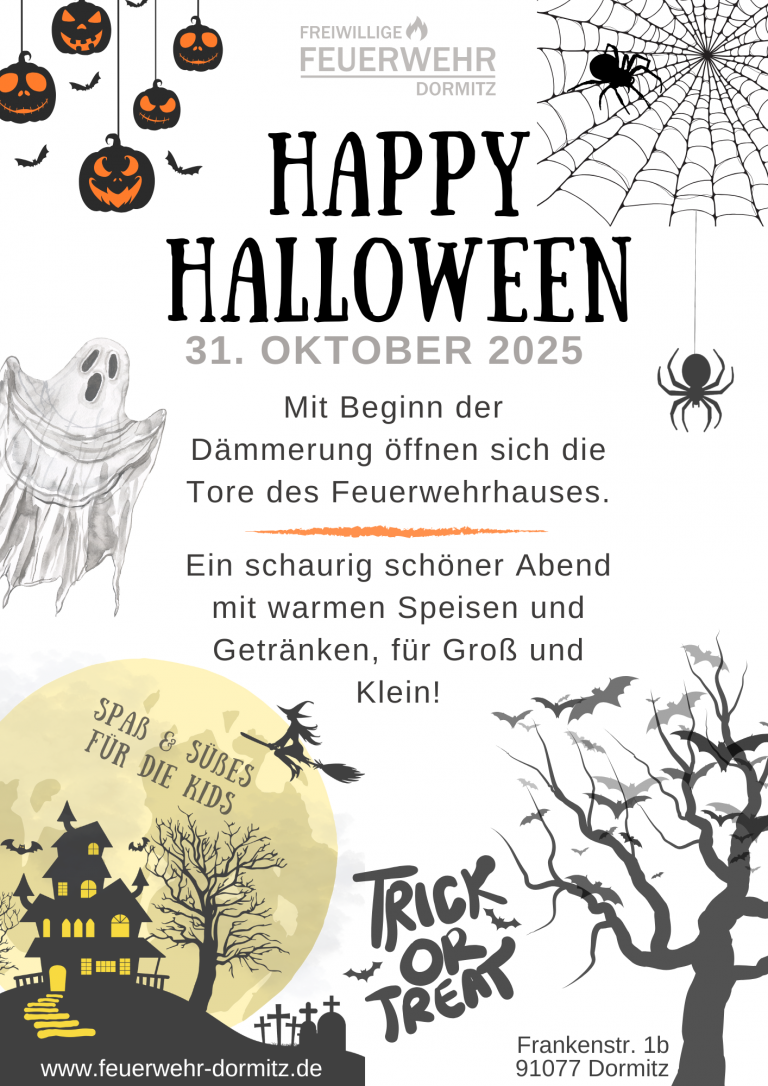 🎃 SAVE THE DATE 🎃 Halloween bei der Feuerwehr! Liebe Nachbarn, Freunde und Familien, gruselt euch schon auf unser Halloween-Event! Die Feuerwehr lädt herzlich zu einem schaurig-schönen Abend mit der ganzen Familie ein. Es gibt Spiel und Spaß, warme Verpflegung und jede Menge Halloween-Stimmung. Kommt gerne kostümiert und bringt eure Familie und Freunde mit. Wir freuen uns auf einen unvergesslichen Halloween-Abend mit euch!